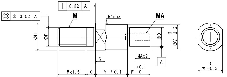 Y≥17時,扳手槽為15,Y<17時,扳手槽銑穿         ! W<E時,兩平面寬度W將擴展到直徑E的部位      !Y+F≤100                     ! MA及Y.F的尺寸請參閱表1后指定。